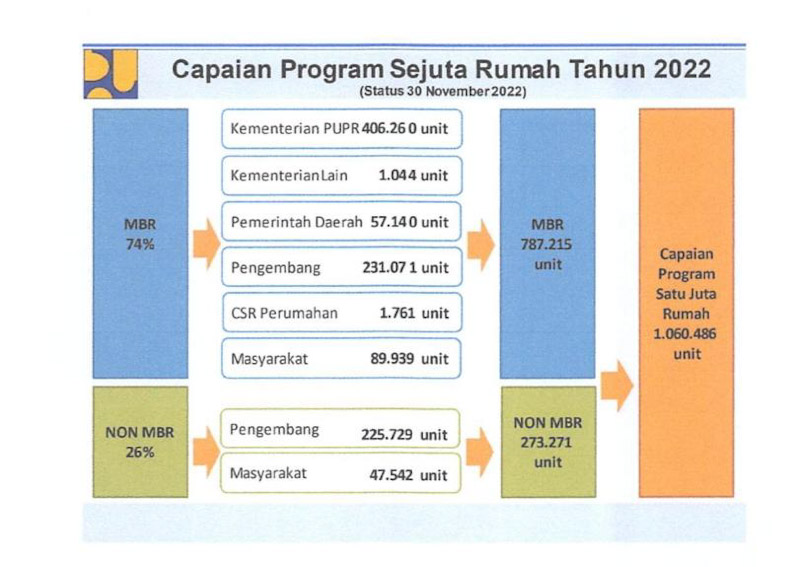 Berdasarkan data yang ada di Direktorat Jenderal Perumahan Kementerian PUPR, capaian Program Sejuta Rumah (PSR) di Indonesia per tanggal 30 November 2022 lalu telah menembus angka 1.060.486 unit. Capaian tersebut terdiri dari 787.215 unit rumah masyarakat berpenghasilan rendah (MBR) dan 273.271 unit rumah non MBR dan tersebar di seluruh wilayah Indonesia.