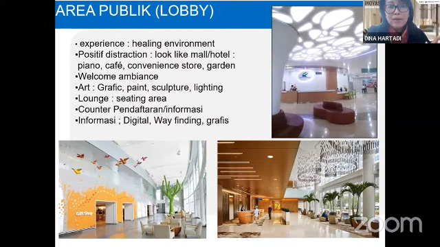Inovasi desain interior sebuah Rumah Sakit yang harus memperhatikan kepentingan nyawa seseorang, tidak bisa dibuat sembarangan terkait penggunanya yang terdiri dari pasien, paramedis, dan tamu yang datang berobat. Desainer Dina Hartadi HDII, Direktur PT Asri Desindo Intiwidya (PT ADI), menyampaikan pengalaman profesinya dalam mendesain interior beberapa Rumah Sakit ternama di Indonesia.