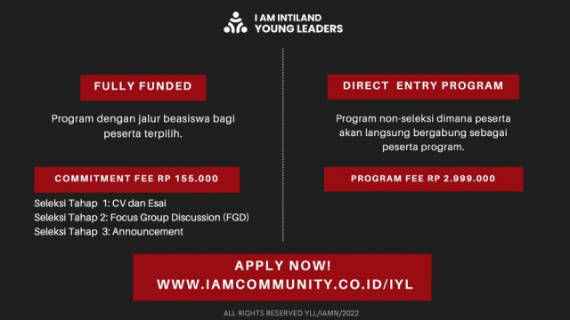 Kegiatan IYL terbuka bagi para generasi muda berusia 18 tahun hingga 30 tahun. Para peserta dapat memilih salah satu dari dua jenis program seleksi yakni melalui jalur Beasiswa untuk peserta terpilih (fully funded) dan direct entry program atau program pembiayaan mandiri.