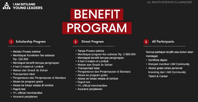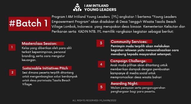 Untuk pengenalan lebih lanjut mengenai program ini, akan diselenggarakan acara Fun Talkshow “Yuk Gabung I AM Intiland Young Leaders untuk Jadi Pemimpin Masa Depan”. Kegiatan diskusi online ini diselenggarakan hari Jumat, 22 April 2022 jam 19.00 WIB secara online dengan sejumlah pembicara dari Kementerian Kelautan dan Perikanan, Kadin Indonesia, Tasola Beach Village, dan praktisi asuransi.