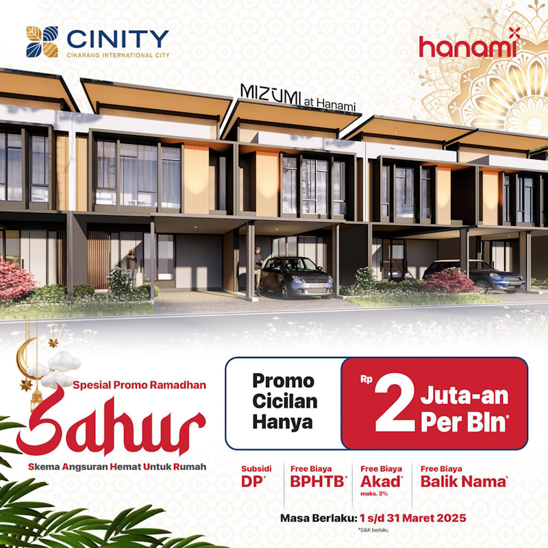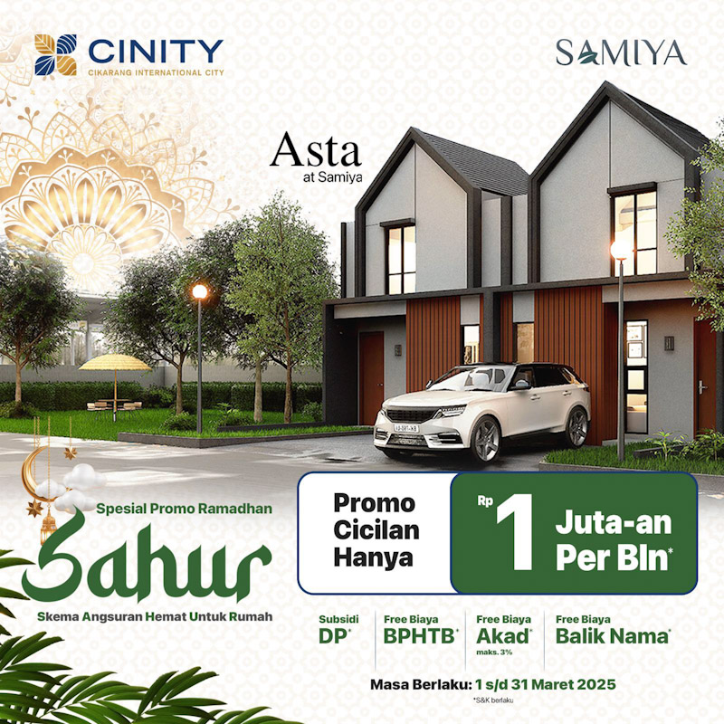 Dengan promo SAHUR (Skema Angsuran Hemat Untuk Rumah) dengan cicilan mulai dari Rp 1 jutaan untuk Cluster SAMIYA dan untuk Cluster MIZUMI cicilan mulai dari Rp 2 jutaan. Harga spesial ini berlaku terbatas karena Anda akan mendapatkan keuntungan berlipat dengan harga khusus, berlaku hanya saat Ramadhan 1 – 31 Maret 2025 dengan syarat dan ketentuan berlaku.